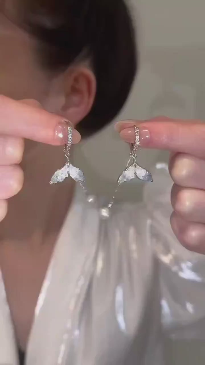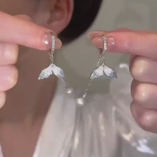 Embrace ocean-inspired elegance with these Mermaid Tail Pearl Drop Earrings, a stunning blend of whimsy and sophistication. Each earring features a delicately sculpted mermaid tail motif, shimmering in 14K white gold-filled metal that resists tarnish and maintains a brilliant shine.
